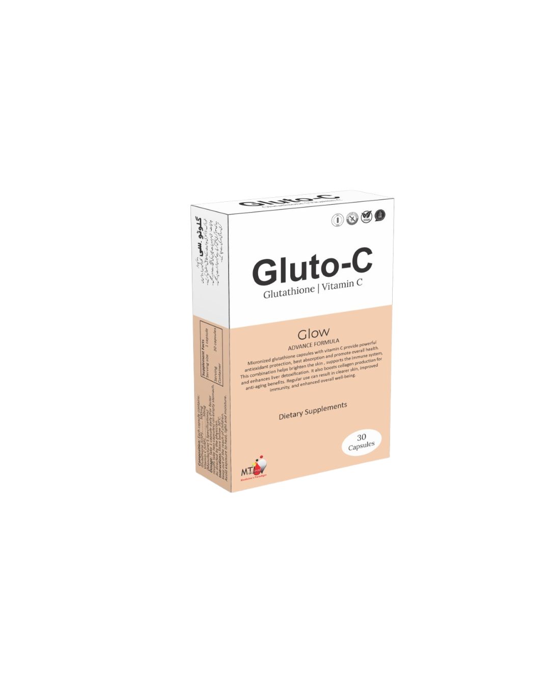 Each capsule contains Glutathione (USP)…500mg, Vitamin C (USP)…50mg